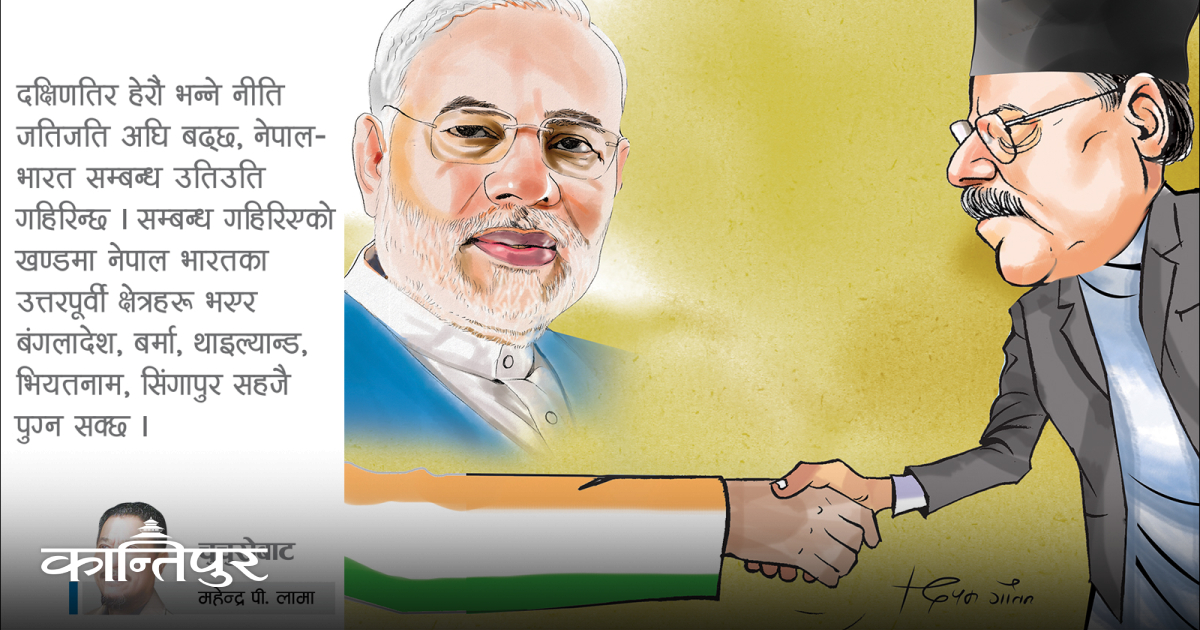 दक्षिणतिर हेरौं भन्ने नीति जतिजति अघि बढ्छ, नेपाल–भारत सम्बन्ध उतिउति गहिरिन्छ । सम्बन्ध गहिरिएको खण्डमा नेपाल भारतका उत्तरपूर्वी क्षेत्रहरू भएर बंगलादेश, बर्मा, थाइल्यान्ड, भियतनाम, सिंगापुर सहजै पुग्न सक्छ । NepalNews