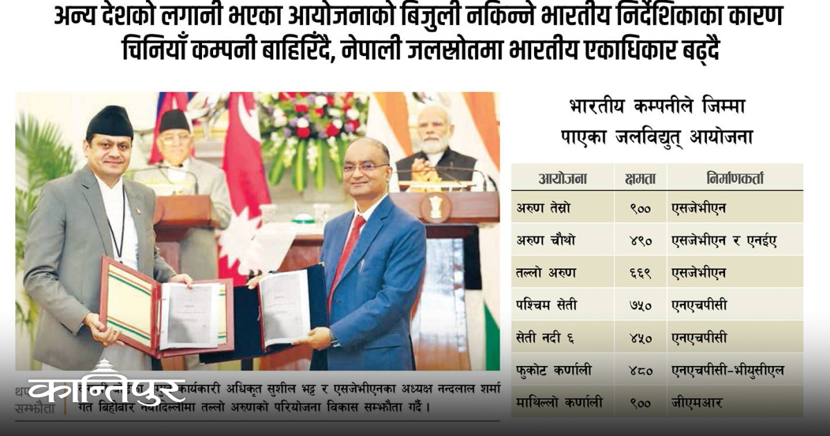 प्रधानमन्त्री पुष्पकमल दाहालको भारत भ्रमणका क्रममा थप दुई जलविद्युत् परियोजनामा हस्ताक्षर भएसँगै नेपालका सात ठूला परियोजना भारतीय कम्पनीका हातमा पुगेका छन् । यी आयोजनाबाट ४ हजार ६ सय ३९ मेगावाट विद्युत् उत्पादनको लक्ष्य छ । लगानी अन्य मुलुकको भएमा विद्युत् खरिद नगर्ने निर्देशिका ल्याएको भारतले नेपाली जलस्रोतमा करिब–करिब एकाधिकार जमाउन लागेको छ ।