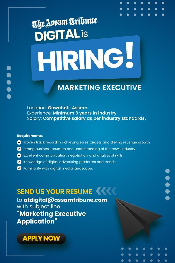 The Assam Tribune (Digital) is looking for a Marketing Executive who has a proven track record in achieving sales targets and has a zeal to grow with the organisation. Interested candidates can email their resume at atdigital@assamtribune.com
