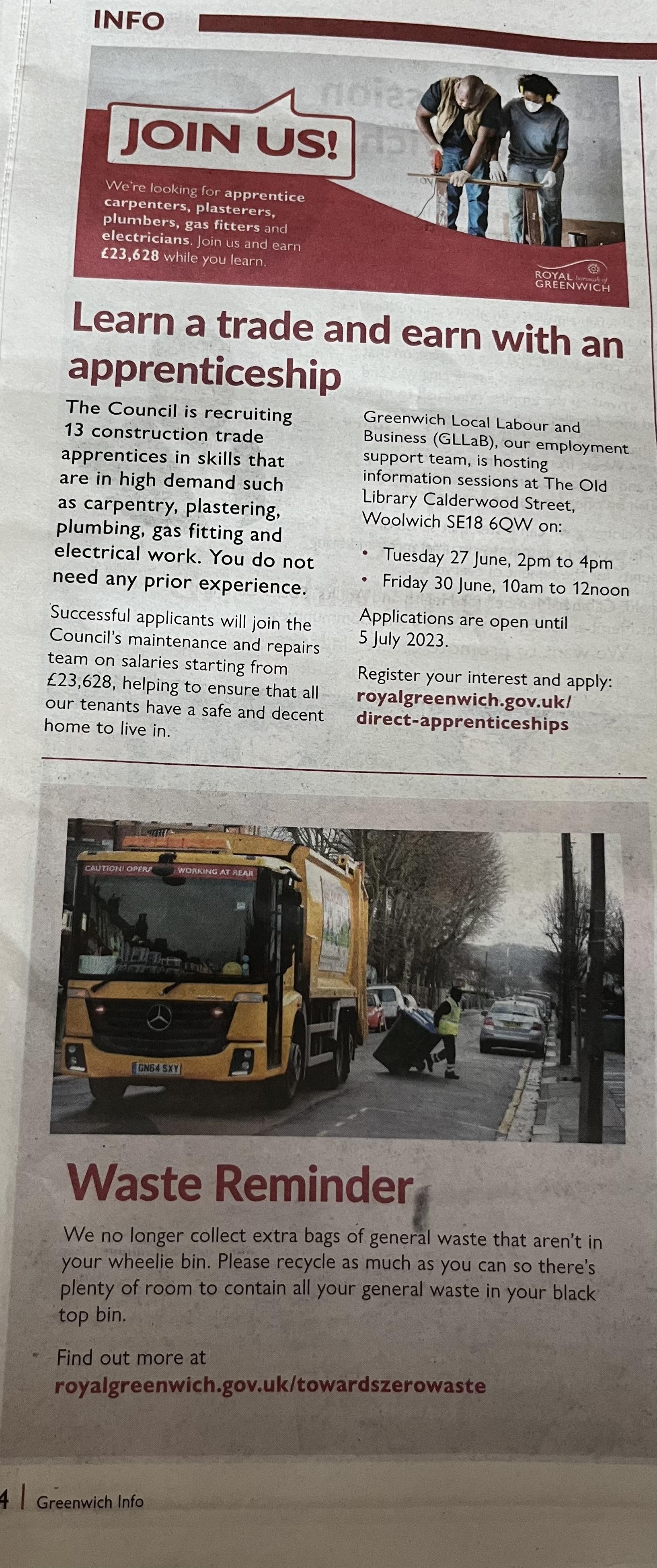 • Carpentry, plastering, plumbing, gas fitting and electrical work- paid training from Greenwich Council.